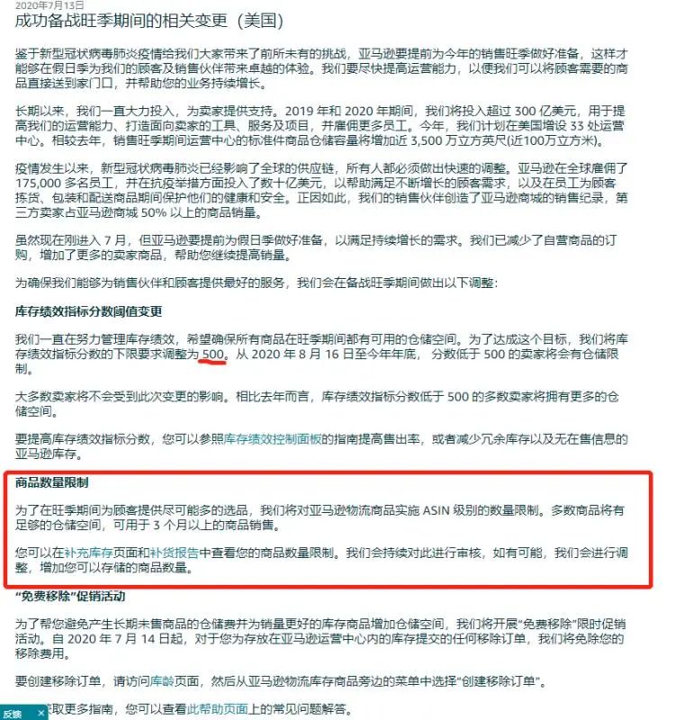1、库存绩效指标分数阈值改为500,从8月16日至今年年底,IPI低于500的卖家将会有仓储限制。