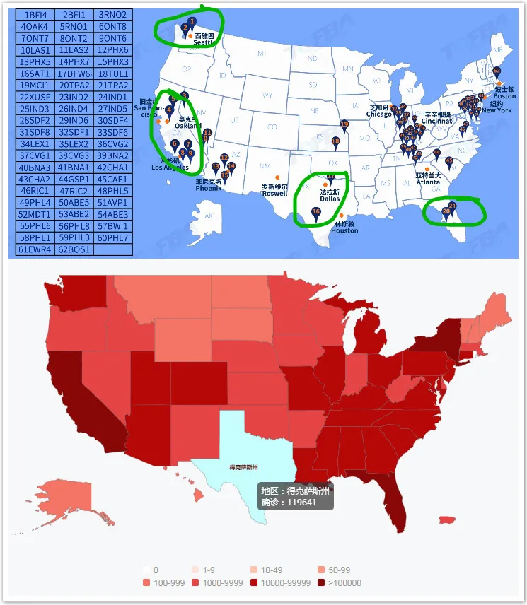 有热心的业内人士制作了一张美国亚马逊仓库分布和美国疫情的对比图。