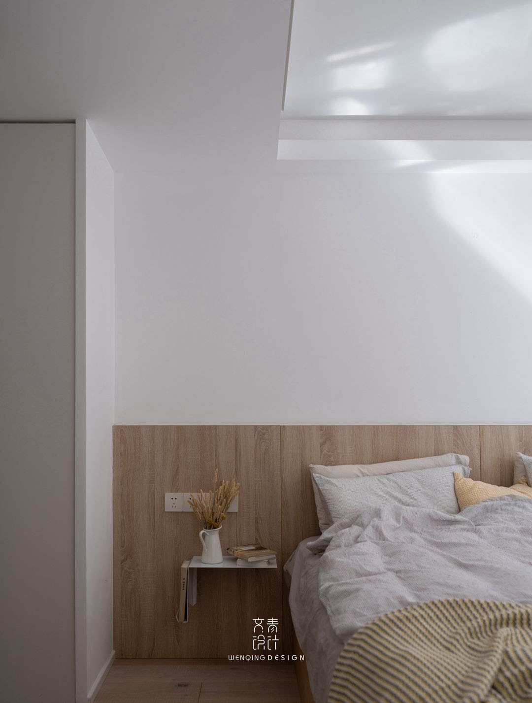 卧室延续客厅设计风格,原木与暖白两色交织,让卧室的氛围回归安静舒适。采用铁艺置物架代替传统床头柜,放上几本睡前读物,睡前也能满足精神食粮。