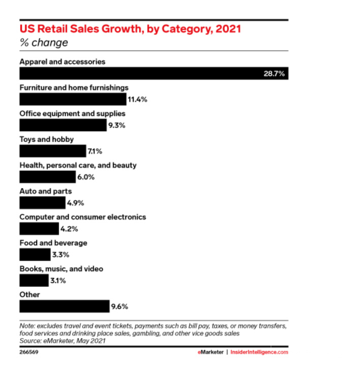 AMZ123获悉,随着美国一些消费者逐步恢复到新冠爆发前的生活方式,eMarketer预测2021年美国服装和配饰的销售额将增长近30%,使之成为迄今为止美国销售额增幅最大的类别。相比之下,家具和家居用品的销售额将增长11%左右,位居第二。办公设备和用品的销售额也将迎来9%的增幅。下图是eMarketer预测的2021年十大热卖品类榜的排名情况及其销售额涨幅详情:小编✎Estella/AMZ123