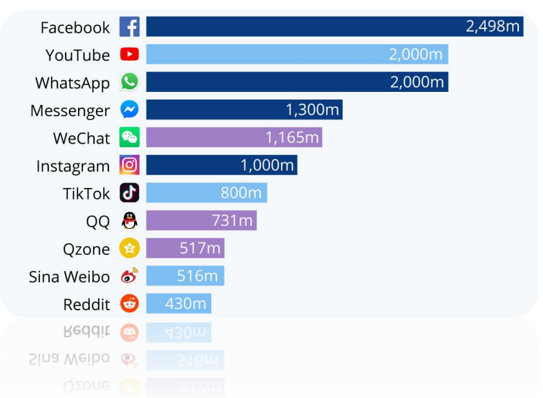 从这个图,可以看到Facebook目前全球用户,24.98亿,用户最多的平台,可以从这个Facebook开始。