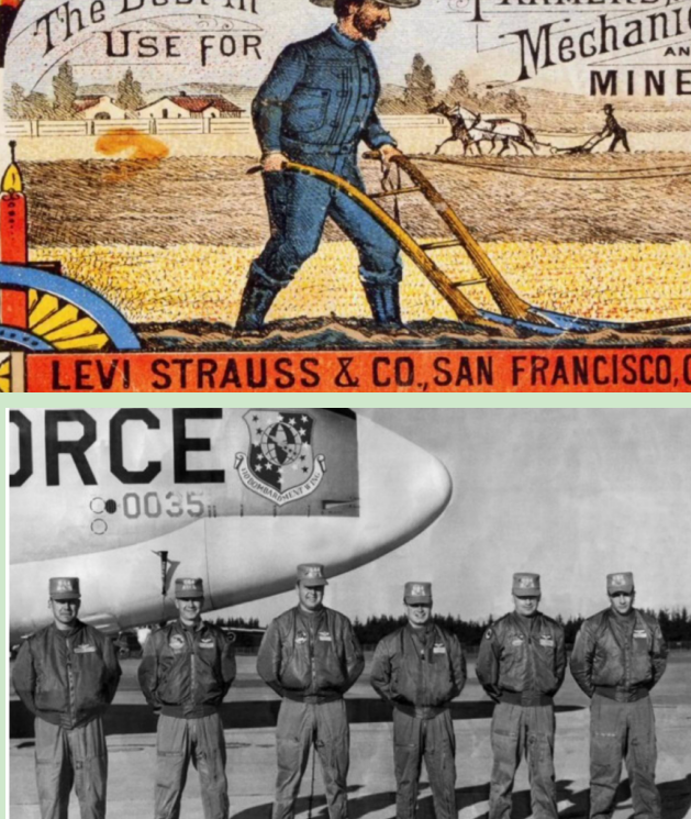 其次美国人一直以来都有将职业装时尚化,并发展成为大众服装的传统。例如牛仔裤最初是美国"淘金潮"时期劳动者为防止裤子磨损发明出来的,再比如很多明星都在穿的 MA1 飞行员夹克也是一战时期美国空军为了训练时保暖求救而设计的。