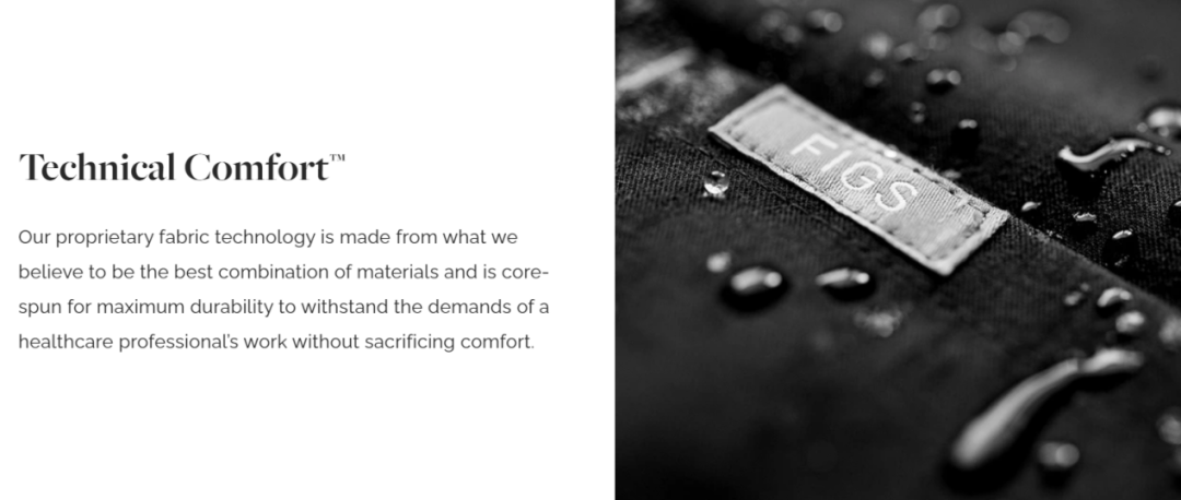 在成立「FIGS」之后,「FIGS」也在服装材质上做了大量文章,引入各种科技来提升医护服的舒适度。例如在官网上,「FIGS」重点介绍了一项叫 Technical Comfort 的面料技术,这项技术可以最大限度地提供服装的耐用性,同时保证舒适性。