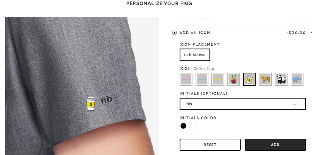 "定制化"是「FIGS」在时尚感上的创新之一,比如在一些款式的服装上,消费者可以定制上自己的名字、图案等,让一件原本单调的医护服增加了一些亮点。