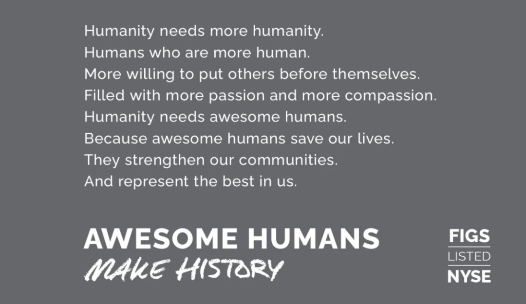 「FIGS」为品牌设计的口号是"Awesome Humans",它想要宣扬的是人类社会中人与人之间互相帮助的奉献精神。
