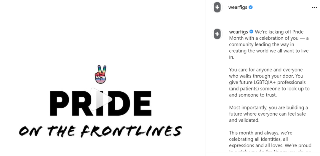 而这样的品牌价值观也成为了「FIGS」在品牌营销时的核心。「FIGS」在社交媒体上的营销活动非常活跃。目前「FIGS」在 Facebook 上有 32 万粉丝,ins 上有 58 万粉丝,在这些社交平台上,「FIGS」一般会结合热点事件发布一些正能量、充满社会责任感的内容,以此来吸引更多价值观相似的消费者。比如最近到了"同志骄傲月",「FIGS」在 ins 上发声呼吁人们尊重同性恋群体。