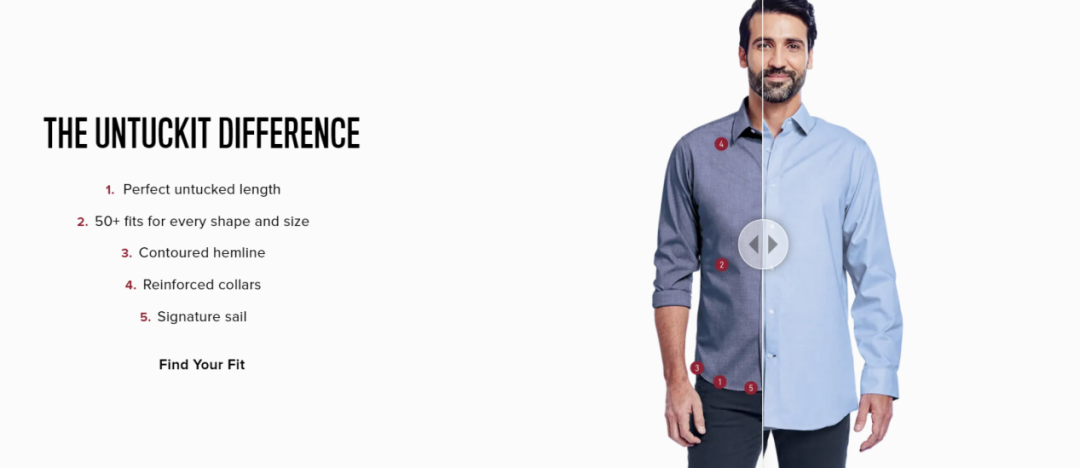 不过即便如此,针对这类人群还是有品牌发现了他们在着装上的痛点。比如美国很多工作的男性都要穿的衬衫,很多人就会面临衬衫下摆太长要塞进裤子里的问题,而 UNTUCKit 的主打产品就是下摆长度刚刚好,不需要把下摆塞进裤子的衬衫。