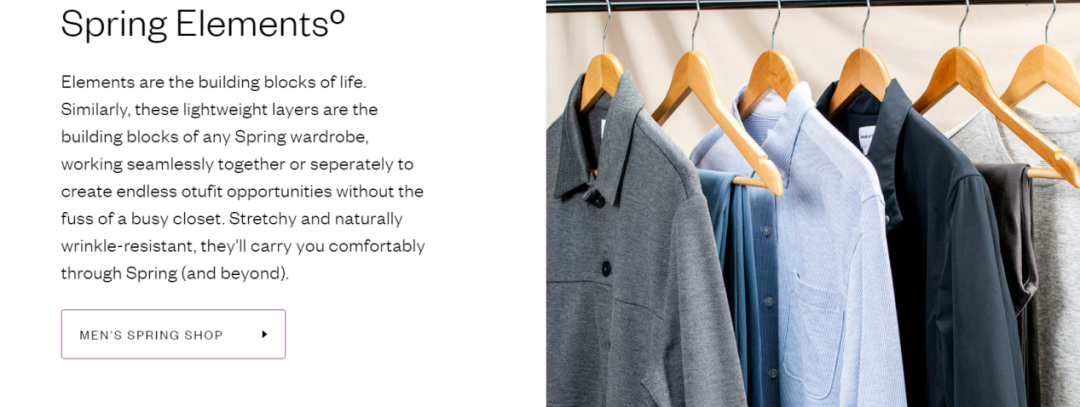 此外也有一些品牌将科技加入到职业正装产品中,以此来提高壁垒。比如 Ministry of Supply 这个品牌,就是把用在太空服的面料用在了职业正装当中,据官网介绍,这样的材质可以循环利用,不会造成资源浪费,而且穿在身上可以起到弹性抗褶皱的效果。