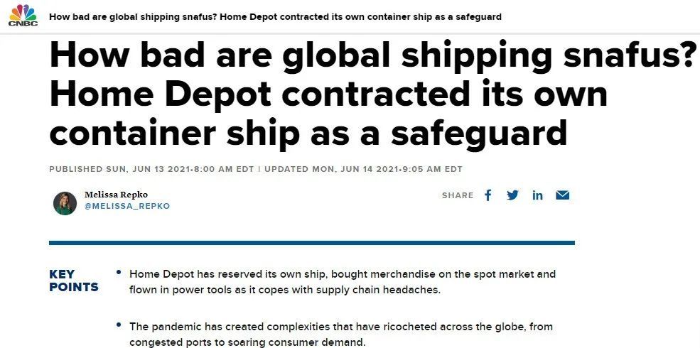 近日,美国排名前三的大型进口商家得宝(Home Depot)宣布,在当前港口拥堵、货柜短缺及新冠疫情拖累运输进度的极端情况下,将租用一艘完全属于自家的货轮,来回航线100%专为家得宝,以缓解当前的供应链难题。