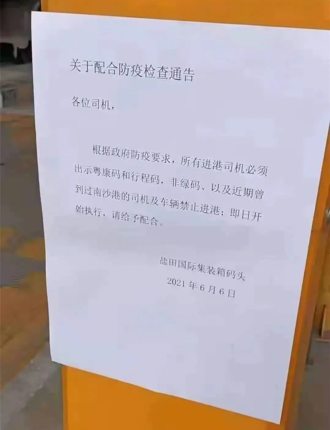 6日,据了解,南沙高速入口 6 日下午 4 时已关闭,通行车辆仅限:抗疫物资运输车辆、必须出区采购生活物资的车辆,其他一律等通知。盐田进港司机必须持:粤康码、行程码;非绿码、近期曾到过南沙港的司机及车辆禁止入港。