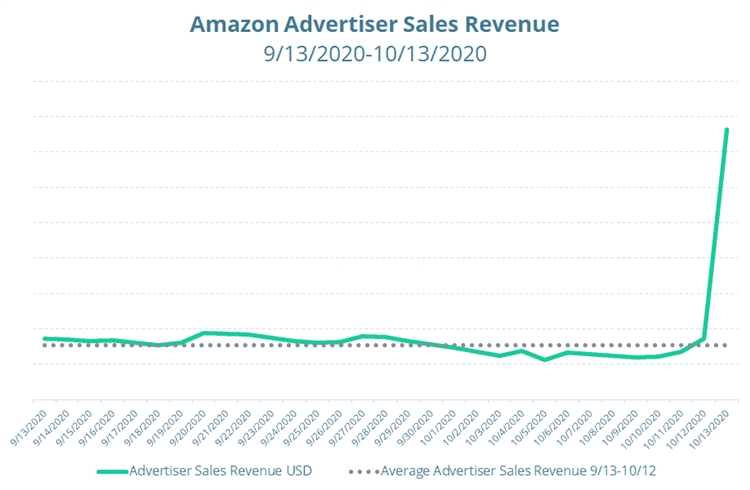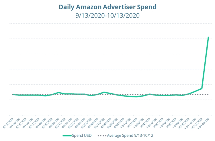 Prime Day期间亚马逊广告商纷纷加码,成效显著。根据一位亚马逊广告客户的数据分析,其在2020年Prime Day前30天里的平均广告支出增长了3.8倍: