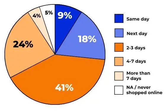 近年来,在线购物者对快速和低成本运输的需求不断增加。其中,消费者对在线交付期望如下图所示: