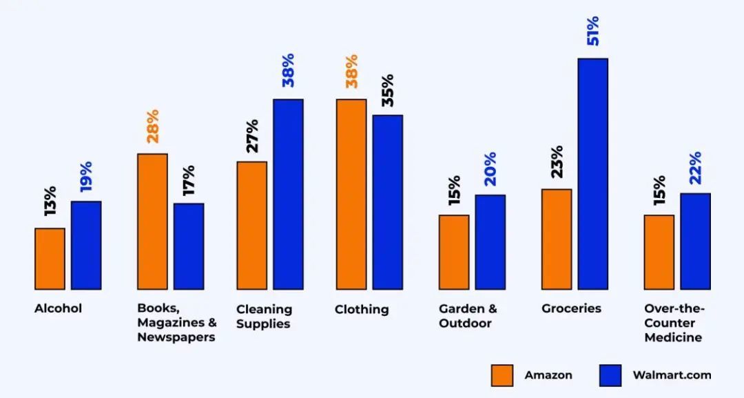 报告表明,沃尔玛吸引了对价格敏感的消费者,以及那些对沃尔玛熟悉的消费者。此外,与亚马逊相比,沃尔玛在杂货产品类别中遥遥领先,51%的沃尔玛购物者表示,他们在第一季度购买了杂货,而在亚马逊上购买杂货的亚马逊购物者中,这一比例为23%。