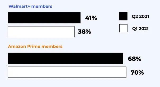 对于Walmart+ 会员与亚马逊Prime会员方面,Walmart+会员数增加了7%。在美国,68%的消费者是亚马逊Prime会员,而订阅Walmart+会员的比例为41%。