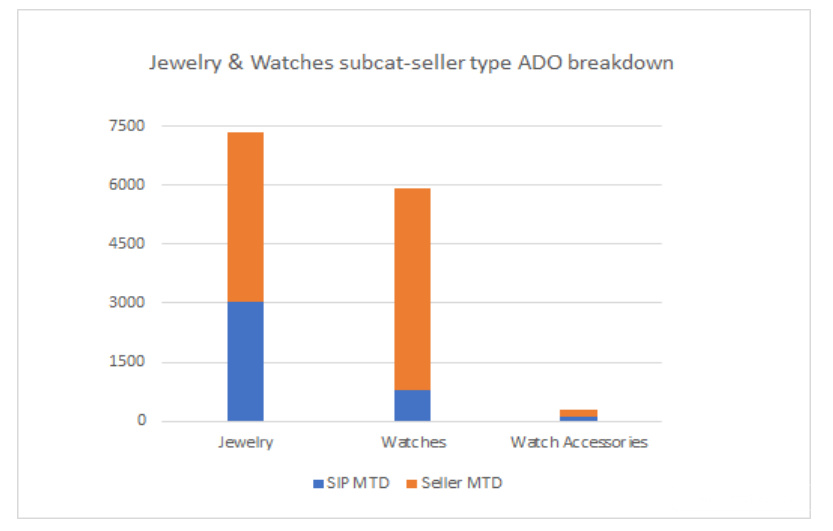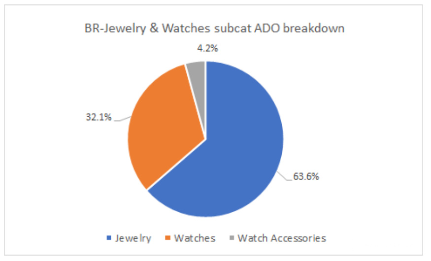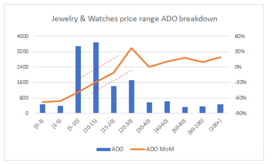 ● 表现最好的子品类(整体): ○ Jewelry ○ Watches热销价格段:[20,30)
