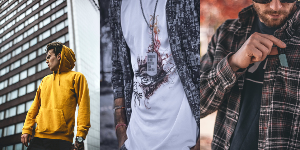 - 卫衣:如果是彩色印花,重视印花设计质量,整体页面风格,时尚感要强,注意色牢度及织物厚度以及口袋处的印刷细节,领口抽绳处可使用金属孔,同时强调袖口、肩部、下摆的细节,增加整体品质感;卫衣的衬里面料触感要好