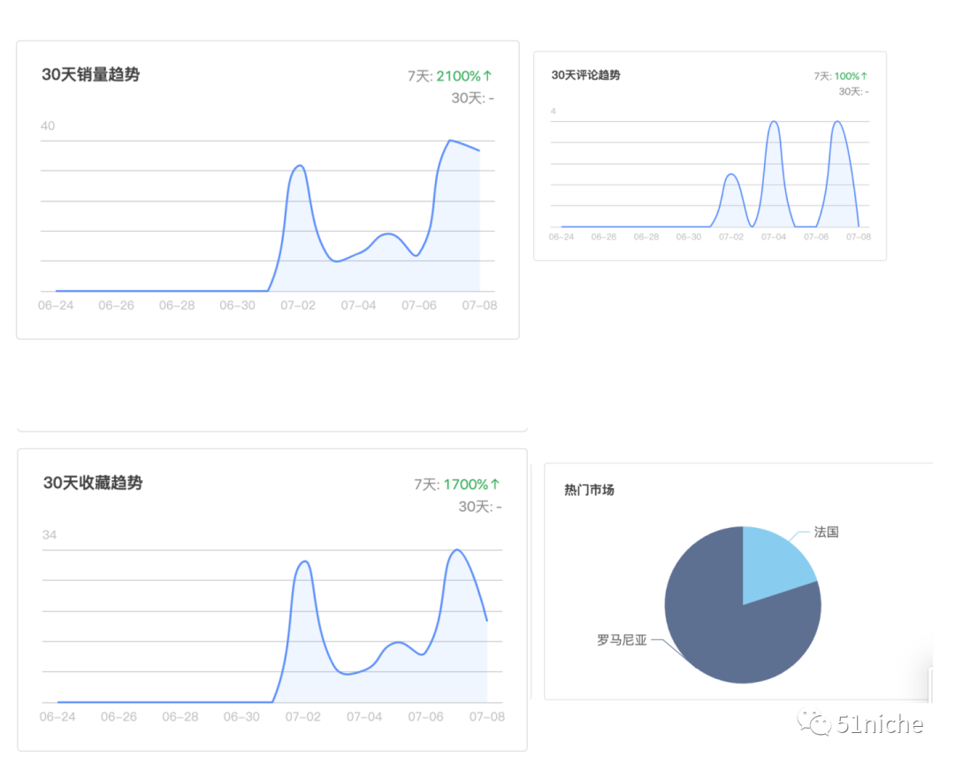 销量趋势图和收藏量趋势图可以预测未来应该还会是一个上升的趋势,虽然近期内销量有些波动,毕竟是新品。 这个产品目前在速卖通的热卖市场是法国和罗马尼亚。