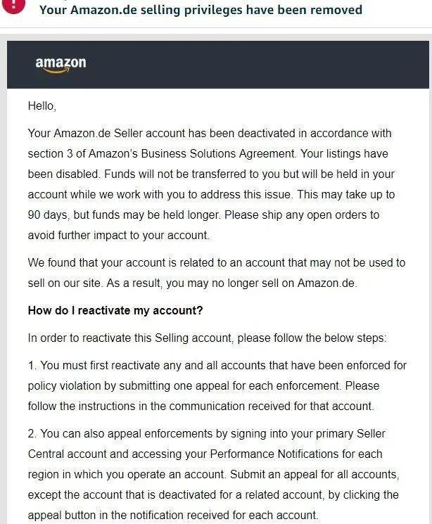 账号关联被封后,我们会收到亚马逊的通知邮件是这样的: