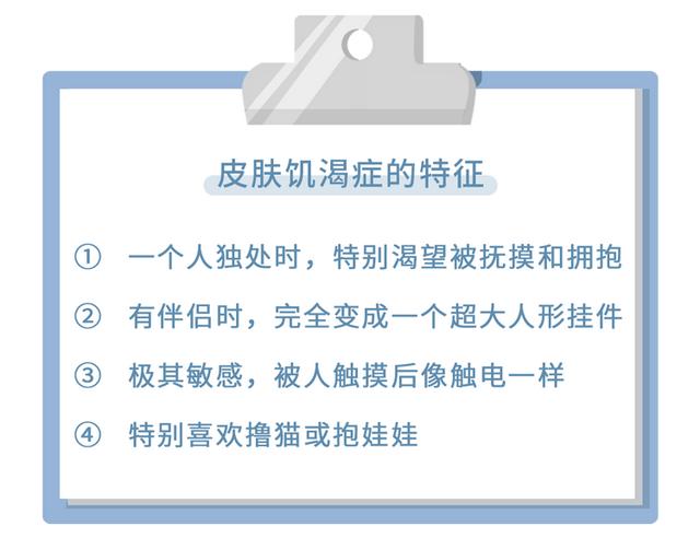 对象总发狂似地想与你接触是爱得太火?还是欲望太强?其实,都不是…你听说过"皮肤饥渴症"吗?顾名思义就是皮肤特别渴望被别人触摸和拥抱这其实是一种心理疾病这类人皮肤敏感程度远超常人当皮肤被触摸特别是拥抱时能获得生理、心理上的强烈满足感但过度依赖这种满足感也会带来负面影响潜移默化的危害有皮肤饥渴症的人一旦渴望得不到满足失眠、焦虑、情绪低落将接踵而至严重甚至会影响正常生活有皮肤饥渴症的女生求抱抱会害怕自己