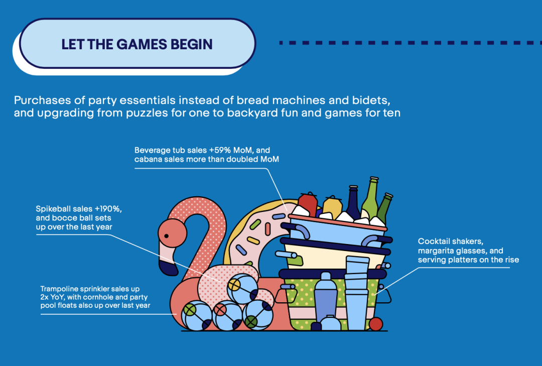 ✦ 蹦床洒水器的销售同比增长2倍,泳池充气玩具和玉米孔游戏相关的商品销售也较去年有所提升。