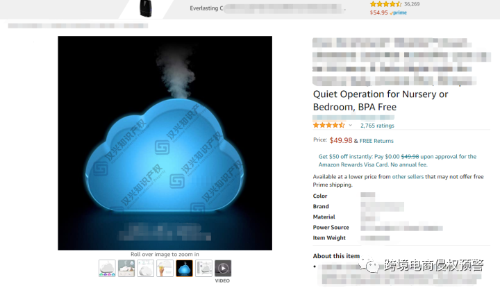 下面这款云形夜灯加湿器,目前在亚马逊美国站评分4.6,现有留评数2,765 ,售价为49.98美金: