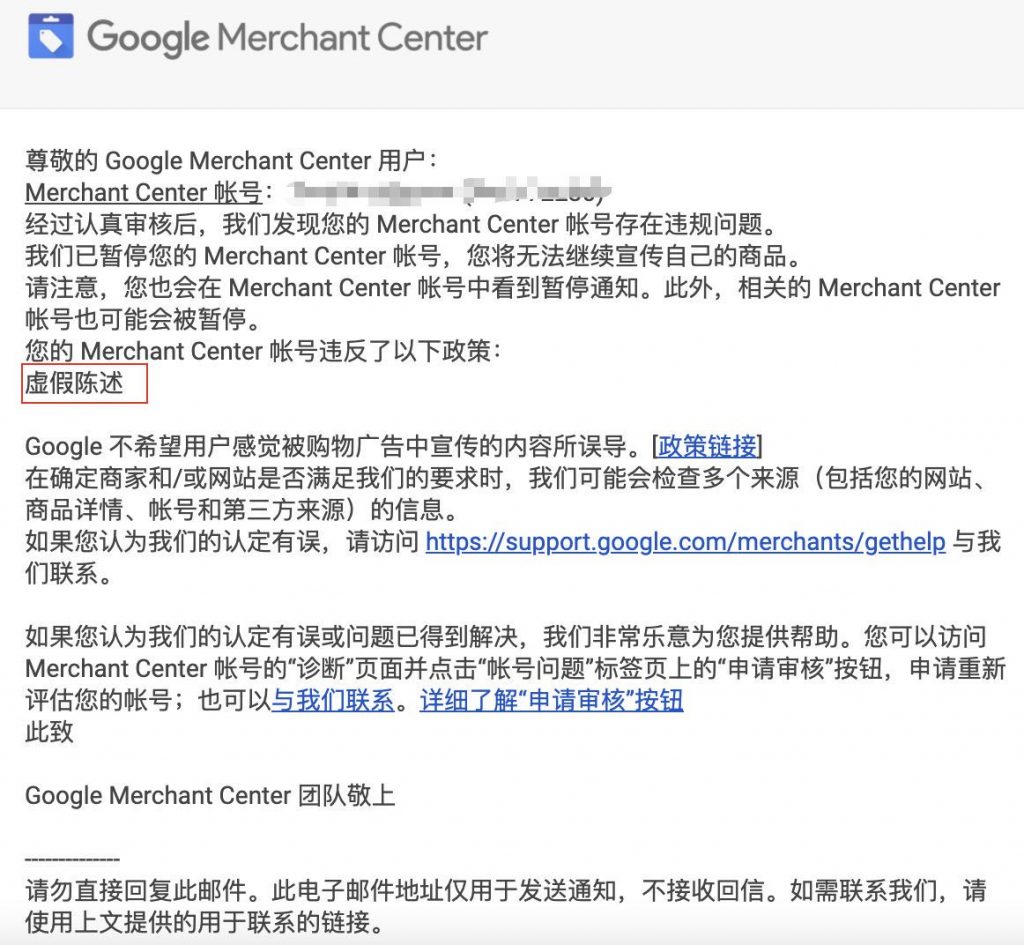 与 Google Ads 封户情况相同,GMC 封户也会收到 Google 官方发来的邮件,邮件内会告知 GMC 账户被封的具体原因: