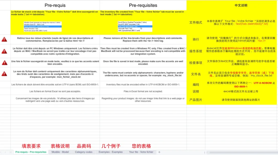 Shop name:填写您的店铺名称Upload mode:Ajout/maj(上传新品/更新)或Ecrasement(覆盖)检查表格格式是否为文本:*.txt (Text (tab delimited)),无误即可发送。邮件发送后,平台技术人员会协助上传。03
