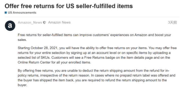 亚马逊美国站近期发布了公告,要求自配送卖家自10月28日起,为所有自配送订单提供免费退货服务!此前欧洲站曾经发过类似的政策,要求时尚类目(包括服装、鞋靴、珠宝、手表等)的卖家为自配送订单提供免费退货服务,而本次美国站的新政策却没有类目和产品上的要求,直接要求卖家承担自配送退货费用,为买家提供免费退货服务。为了鼓励卖家积极提供免费退货服务,亚马逊还在产品详细信息页面和卖家产品的在线退货中心上看到免费