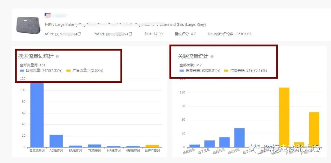 通过跟踪我可以清楚的知道竞品listing 搜索流量里面,所有关键词自然搜索流量占比97%以上,这能反应一个问题就是这个品大部分关键词都有一个比较好的排位,其次相应的也获得了amazon choice、编辑推荐等等,搜索流量相当丰富。对比之后你就会发现自身的listing和他的具体差别。