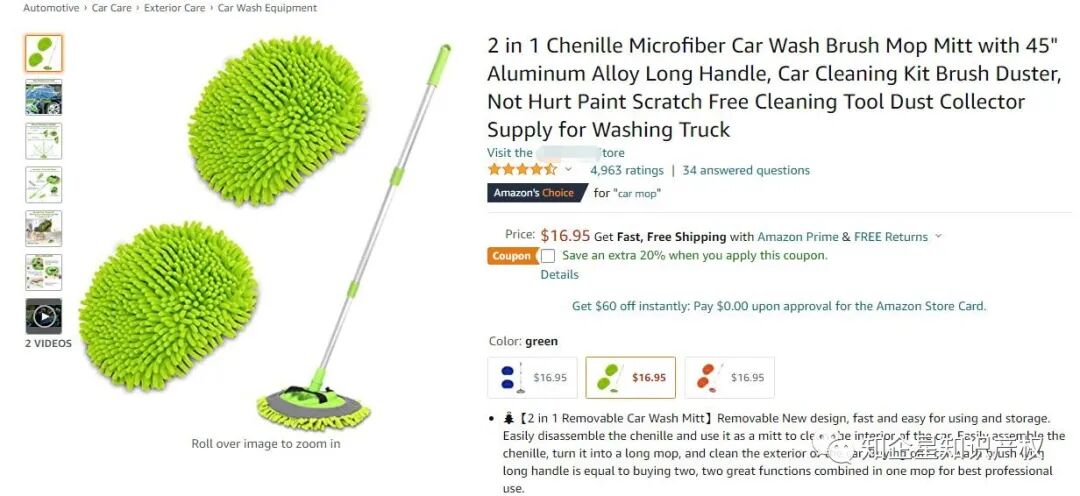 今天在浏览亚马逊的时候,看到一款洗车刷,它是美亚站的Amazon's Choice for "car mop",售价16.95美金,留评4963颗星。