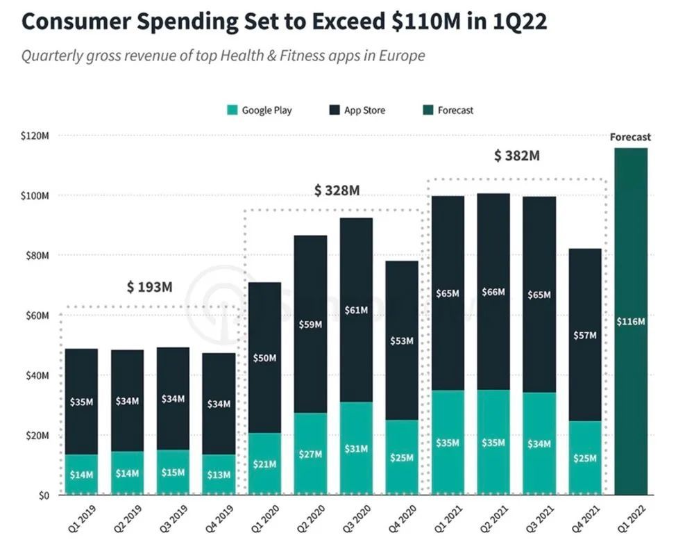 Sensor Tower 的统计数据显示,欧洲市场 2022 年第一季度健康与健身类 App 用户内购收入有望超过 1.1 亿美元,增长幅度达到 140%。