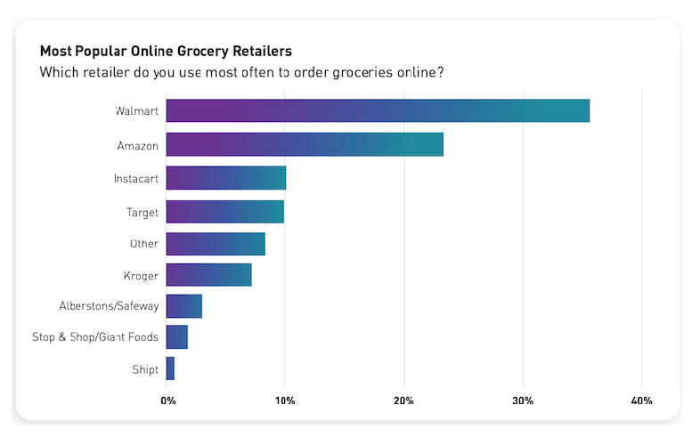 AMZ123获悉,根据Chicory第三次年度在线杂货调查,超过35%的美国消费者将沃尔玛列为他们最常购物的在线杂货零售商。电商巨头亚马逊位居第二,约23%的消费者将它列为首选杂货零售商。