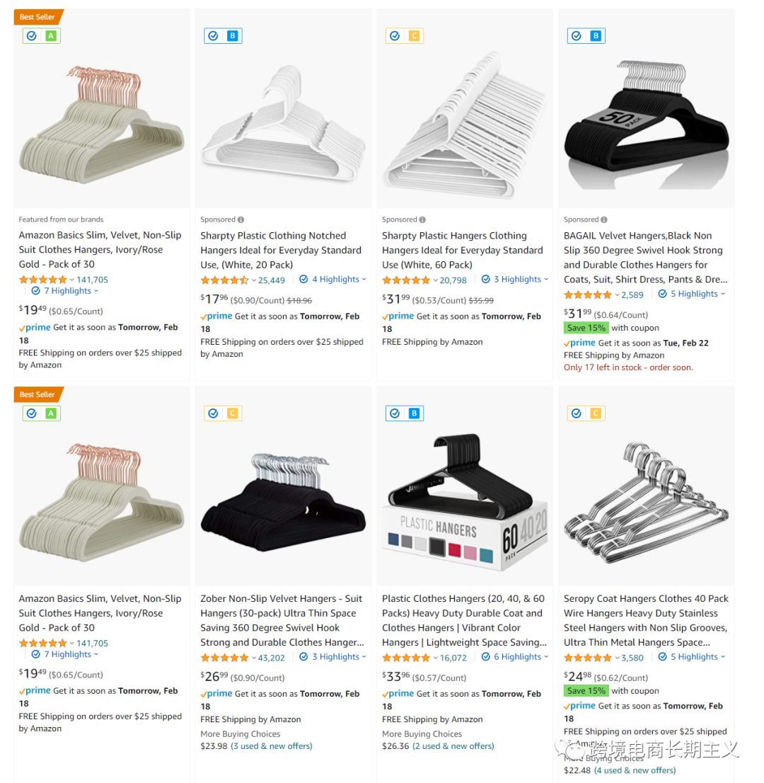 去年接触一个供应商告诉我他们的衣架成本去到了十六七块,注意不是一打的价格,而是一个的价格,当时我一愣,直接去亚马逊上搜索了衣架这个关键词,得到的搜索结果如下: