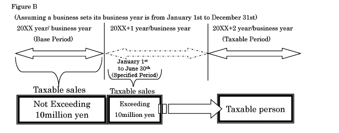 不属于上述第(1)、(2)项的业务,其指定期间应纳税销售额超过1000万日元的业务(指定期间原则上为纳税期间前一年的前六个月)。"1000万日元"的特定时期可以使用工资和相关支付总额来判断,而不是使用应税销售额。(Figure B)