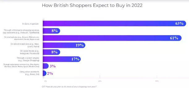 AMZ123获悉,根据Salsify最新发布的《2022年消费者研究》,2022年预计只有19%的英国消费者在DTC品牌网站购物,更多的人将在店内(63%)或通过第三方电商平台购物(61%)。