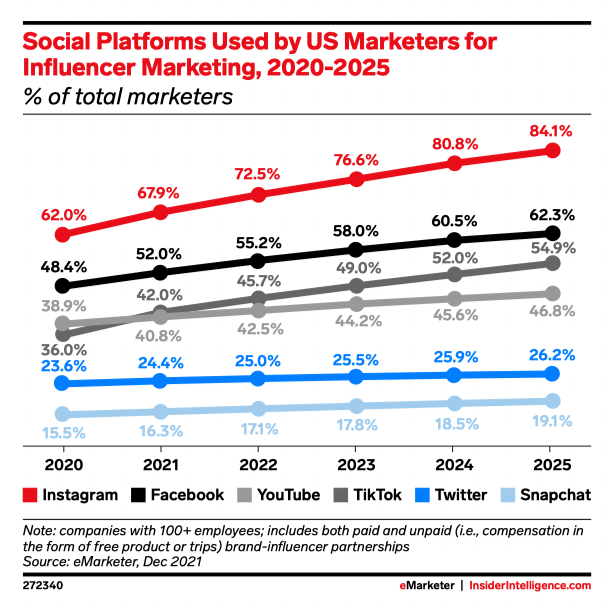 2020 - 2025 年美国商户用于网红营销的各社媒平台市场占比|来源:eMarketer