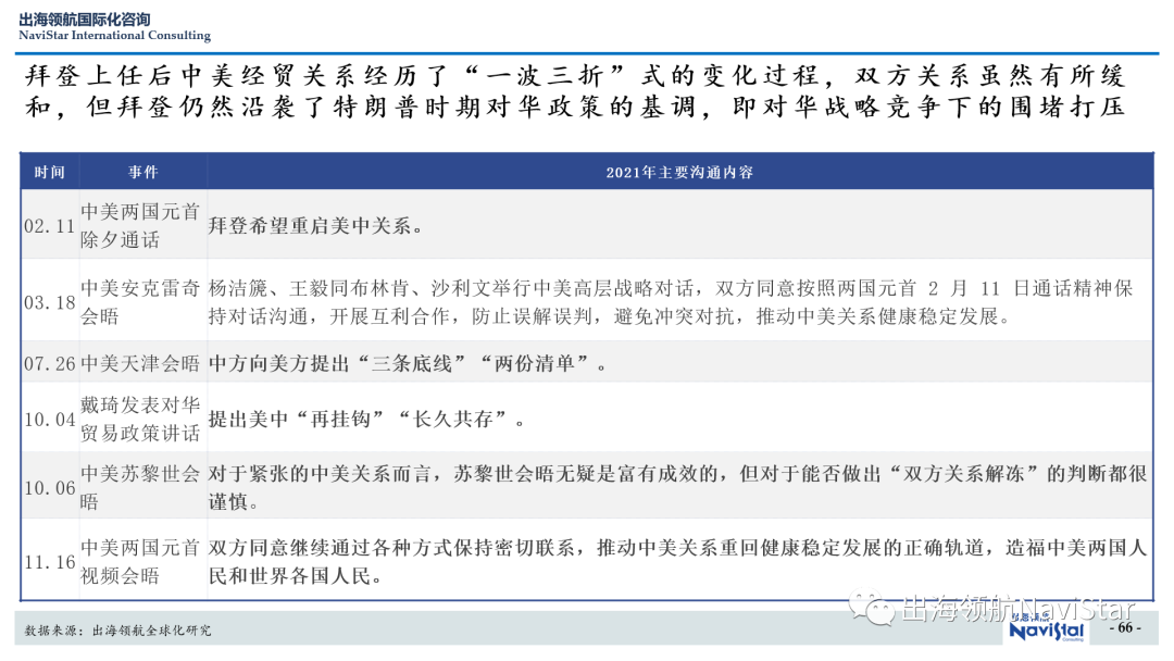 拜登总统上任后中美经贸关系经历了"一波三折"式的变化过程,双方关系虽然有所缓和,但拜登仍然沿袭了特朗普时期对华政策的基调,即对华战略竞争下的围堵打压。对于前任特朗普总统的错误政策,包括单边关税、科技封锁和对中国企业的单边制裁,没有任何改变,甚至在某些领域愈演愈烈。