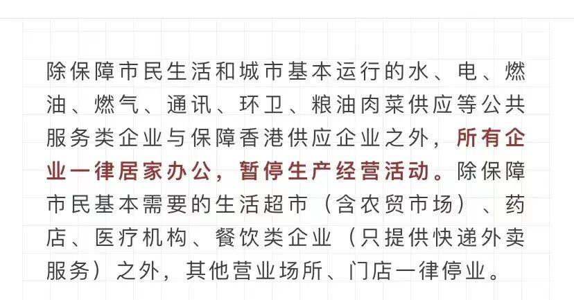 Employees of enterprises, except those responsible for the supplies of daily essentials like water, electricity, fuel, gas, communications, food and public sanitation, are also required to work from home, or suspend production and operation activities. Business venues, except supermarkets selling daily necessities (including the a.............