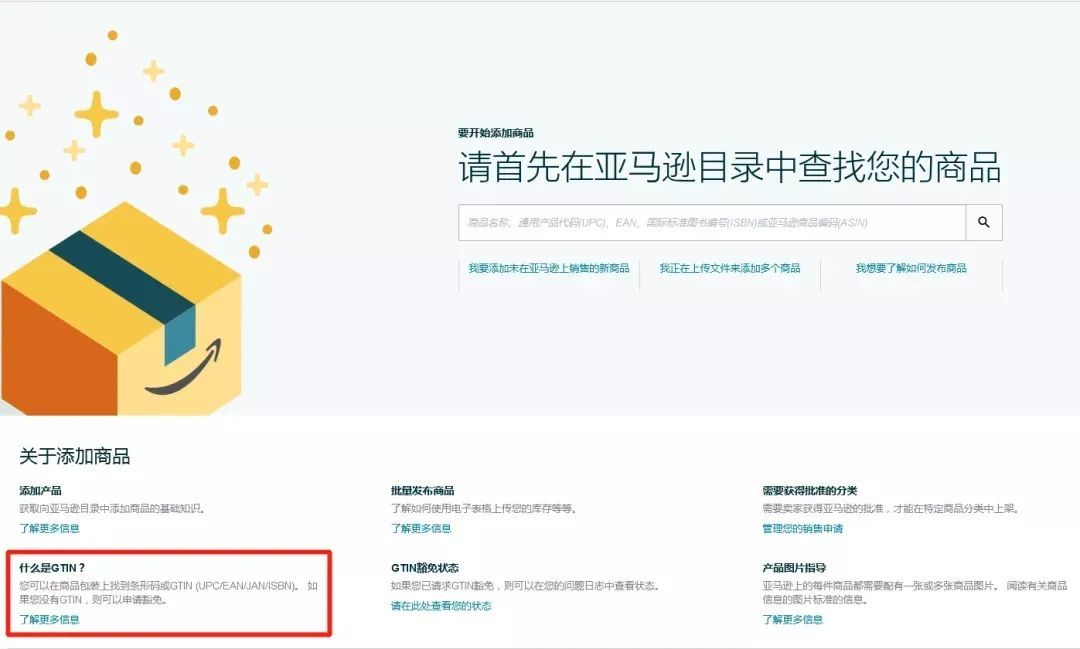 a、进入添加产品页面,点击左下角"什么是GTIN"下方的"了解更多信息";