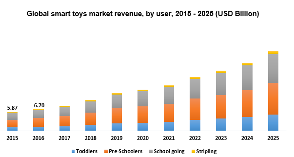 全球智能玩具市场营收 2015-2025(单位:10亿美金)![]()
