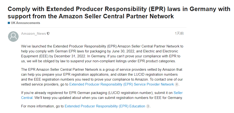 近期,亚马逊、速卖通等平台再发公告提醒卖家注册德国EPR的包装法类目
