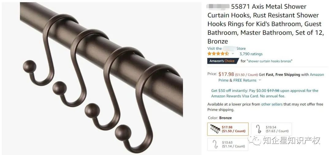 今天在浏览亚马逊的时候,看到一款浴帘挂钩,它是美亚站的Amazon'sChoicefor "oil rubbed bronze shower curtain hooks" 售价17.98美金,留评3791颗星。