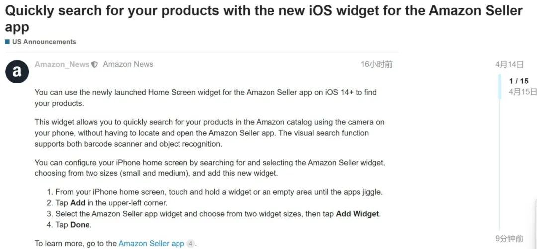 亚马逊为卖家推出iOS小部件亚马逊美国站、欧洲站和日本站发布公告称,亚马逊为卖家推出iOS小部件,卖家现在无需打开亚马逊卖家应用程序,可以在iOS14+上使用新推出的亚马逊卖家应用程序主屏幕小部件来查找产品。此小部件允许卖家使用手机上的相机在亚马逊目录中快速搜索产品,视觉搜索功能同时支持条码扫描和生物识别。卖家可以通过搜索和选择亚马逊卖家小部件,从两种尺寸(小号和中号)中进行选择,然后在iPhone主屏幕添加这个新小部件。