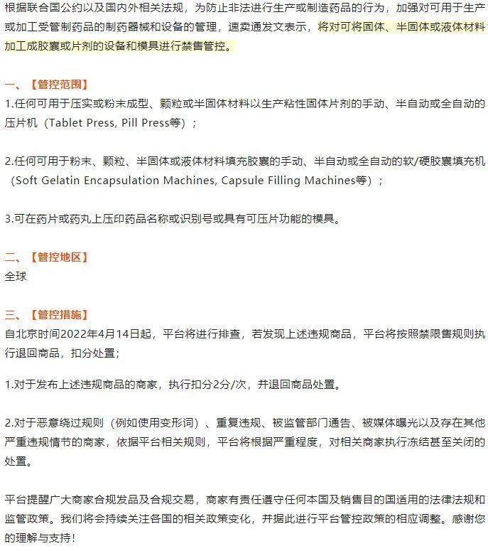 -eBay-eBay新增四家认证对接仓eBay近日发布通知称,为助力卖家拓展海外仓业务,经层层选拔考核,eBay现新增橙联(环球)集团有限公司美国仓、乐仓信息科技有限公司美国仓、深圳米仓飞鸟国际供应链管理有限公司英国仓,以及深圳市中运国际科技有限公司澳大利亚仓为eBay认证对接仓。截止至2022年4月14日,eBay已对24家海外仓储服务供应商授予eBay认证对接仓称号。此外,如卖家通过eBay认证对接仓发货,请务必确保交易数据(包含eBay交易编号和物品编号)及时准确地上传至eBay认证对接仓以符合海外仓服务标准帐号免考核。 -速卖通-速卖通禁止销售压片机速卖通近日发文称,将对可将固体、半固体或液体材料加工成胶囊或片剂的设备和模具进行禁售管控。自北京时间2022年4月14日起,速卖通将进行排查,若发现上述违规商品,速卖通将按照禁限售规则执行退回商品,扣分处置。对于恶意绕过规则(例如使用变形词)、重复违规、被监管部门通告、被媒体曝光以及存在其他严重违规情节的商家,依据平台相关规则,速卖通将根据严重程度,对相关商家执行冻结甚至关闭的处置。速卖通提醒广大商家合规发品及合规交易,商家有责任遵守任何本国及销售目的国适用的法律法规和监管政策。