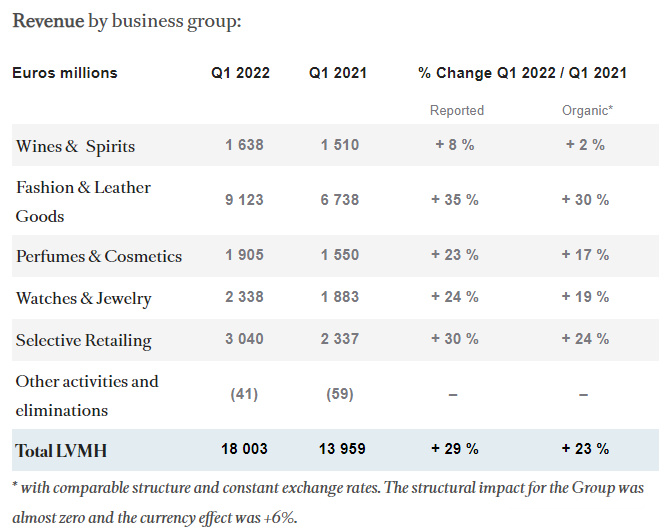 品牌方舟获悉,全球奢侈品巨头LVMH Moët Hennessy Louis Vuitton在2022财年(FY22)第一季度(Q1)录得收入180亿欧元,较2021年同期增长29%。在疫情和全球供应链危机的背景下,加上俄乌冲突的持续发酵,LVMH今年开局良好。除葡萄酒和烈酒业务继续面临供应紧张外,其他业务均实现了两位数的收入增长。欧美市场也实现了两位数的收入增长;由于新一波疫情的冲击,中国在3月份收紧了防疫限制措施,但其亚洲业务在本季度仍保持增长趋势。