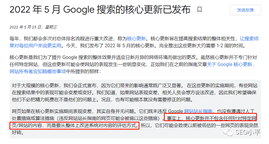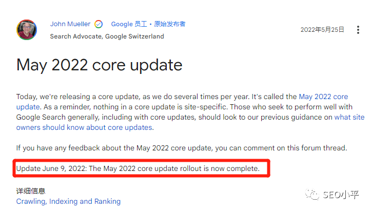 每年,谷歌都会多次对总体排名流程进行重大改进,称为核心更新。核心更新旨在提高搜索结果的整体相关性,让搜索结果对每位用户来说更实用。最近,谷歌发布了 2022 年 5 月的核心更新,到6月9日谷歌元老级员工 John Mueller 说本次更新完成。