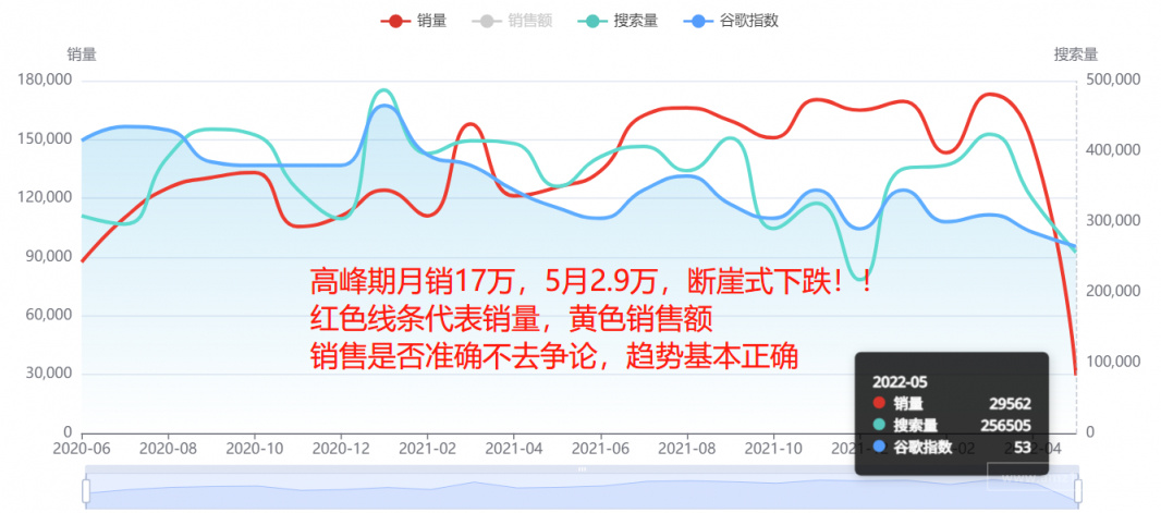 高峰期月销17月,5月份暴跌至2.9万。