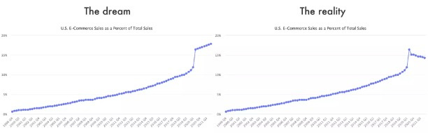 衡量电商市场的一个指标是看其在零售总额中的份额,整体电商支出也同样重要。MarketplacePulse研究显示,当前电商市场份额比疫情初期预测的要小,渗透率的萎缩又比疫情初期预测的要大。
