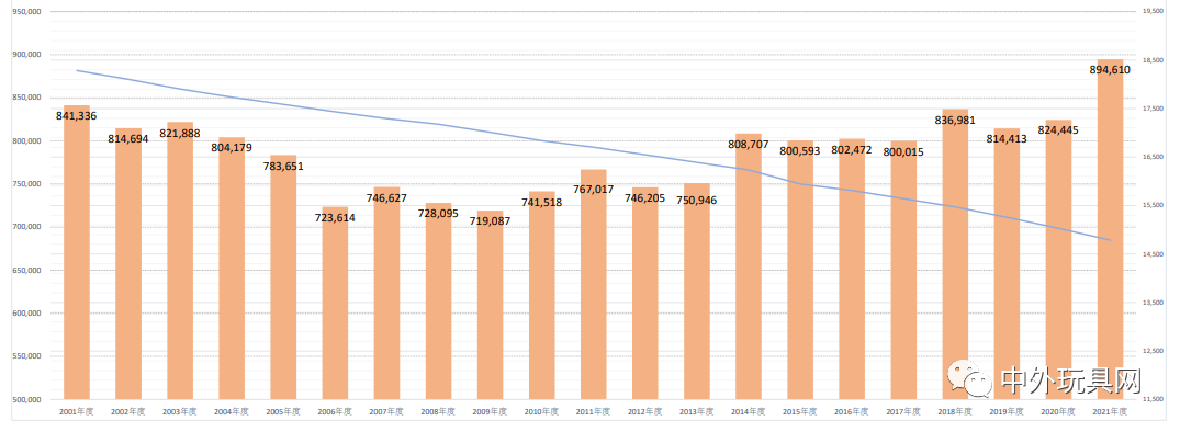 在展会开幕前夕,日本玩具协会公布了2021财年(2021.04-2022.03)的日本玩具市场数据。全财年日本玩具市场规模为8946亿日元(约合446亿元人民币),同比增长8.5%,创下日本玩具协会自2001年调查记录日本玩具市场规模以来的新高。与此同时,日本厚生劳动省6月3日发布数据显示,2021年日本全国出生人口才80多万,连续41年下降,是有记录以来的最低水平。