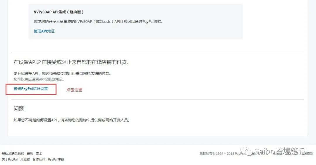 点击API更新后,跳转到"您的付款API凭证"页面,点击底部的"管理paypal结账设置"